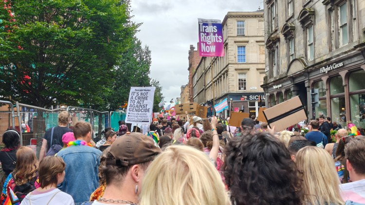 For the fourth year in a row, I was attending the Pride march in Glasgow. I have talked about the experience in previous blogs released around this time of year. Saturday was mild and cloudy, but we all expected rain around lunchtime, though it was clear some were dressed clearly hoping it wouldn’t come at all! But, sadly for them, it did, and there were soggy sequins and a scattered array of umbrellas as the march finished.